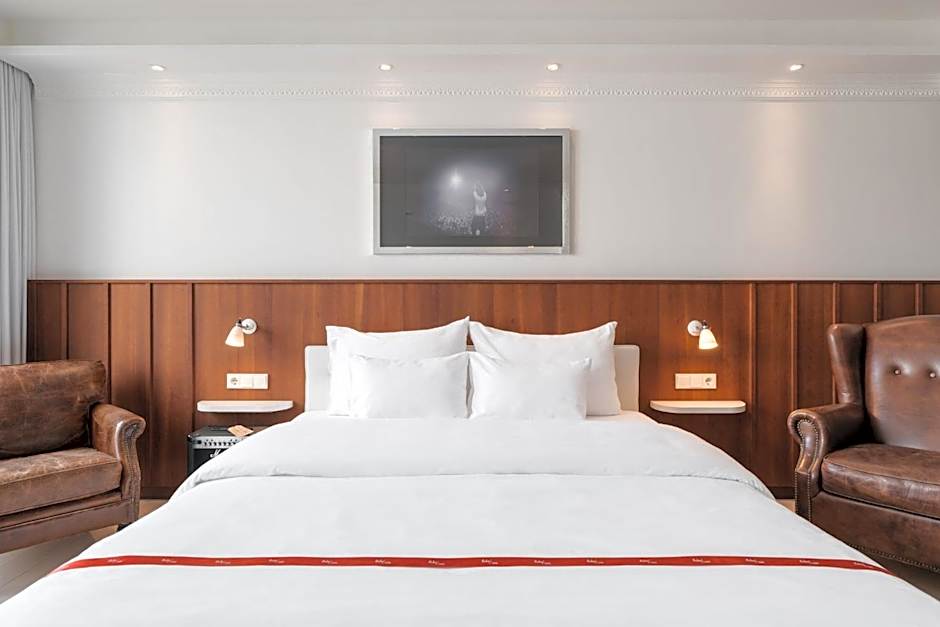 Big and stylish, air-conditioned room with a 40" flat-screen TV, and a sound system. Further amenities are an open-plan bathroom with rain shower and hairdryer, a tablet computer, free WiFi and a safety deposit box. Please note that the rooms do not provide twin beds, only double beds.