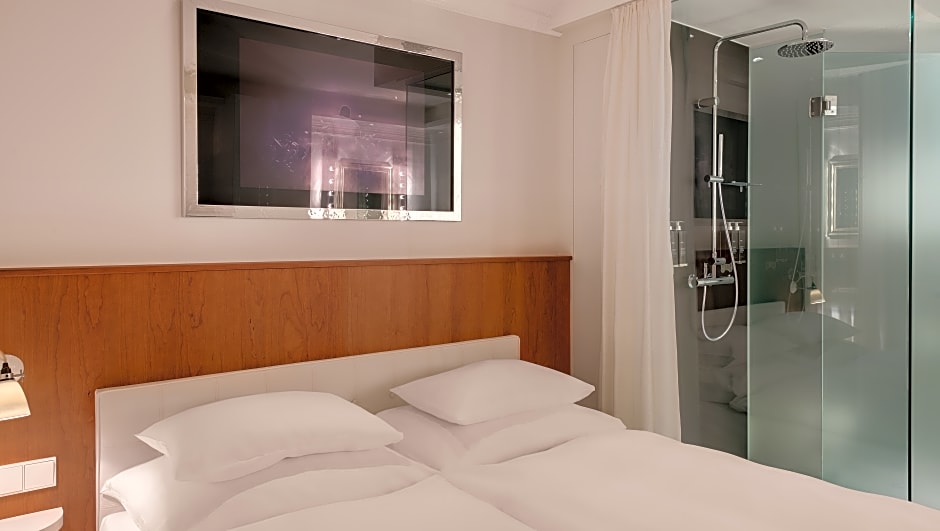 Big and stylish, air-conditioned room with a 40" flat-screen TV, and a sound system. Further amenities are an open-plan bathroom with rain shower and hairdryer, a tablet computer, free WiFi and a safety deposit box. Please note that the rooms do not provide twin beds, only double beds.